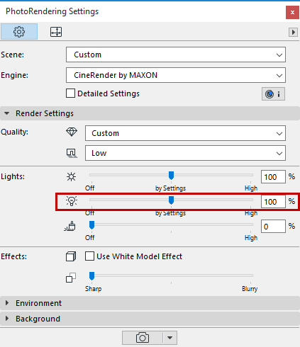 Adjusting this slider in PhotoRendering Settings will override individual lamp settings and either increase or decrease them accordingly.