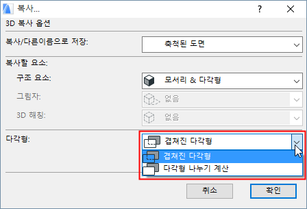 대화상자의 아래쪽 부분에서, 보이지 않는 다각형들과 (예를 들어, 벽 뒤에 있는 창문의 다각형 요소들) 보이는 것들 중 어느 것을 저장/복사할 것인지 정의할 수 있습니다. 또한, 다각형들을 프레임을 포함해서 또는 하지 않고 복사하는 옵션을 가지게 됩니다.