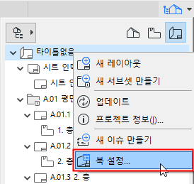 내비게이터 레이아웃 북 구조에서 레이아웃 북 아이콘의 컨텍스트 메뉴를 사용하거나, 혹은 레이아웃 북 아이콘이 트리 뷰에서 선택되었을때 내비게이터 팔레트의 하단에 있는 설정 버튼을 사용합니다.