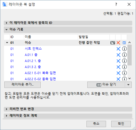 레이아웃 북 설정의 이 패널을 사용하여 수정 관리의 일환으로 전송 세트를 생성하고 관리합니다.