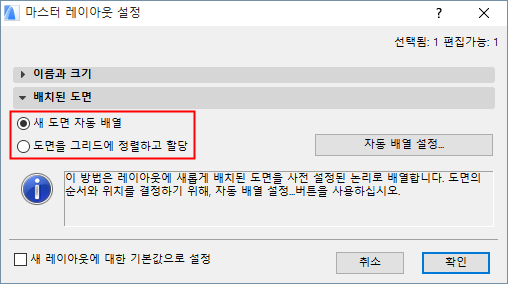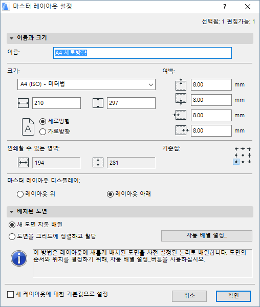 참고: 기본값 로직은 “자동 배열” 입니다. 레이아웃에 단 하나의 드로잉만 배치하는 경우, 레이아웃의 중심에 배치됩니다.