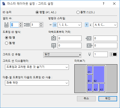 이 옵션을 선택하는 경우, 그리드 설정을 클릭하여 그리드 설정 옵션을 이용합니다. 이들 옵션을 설정할 때, 미리보기 그림을 참조하십시오.
