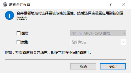 •例如,如果您勾選“類別”,然後,即使填充不分配給相同的填充類別(例如:一種填充是"繪製"填充,而另一種是"覆蓋"填充),但程序將合併鄰接填充。