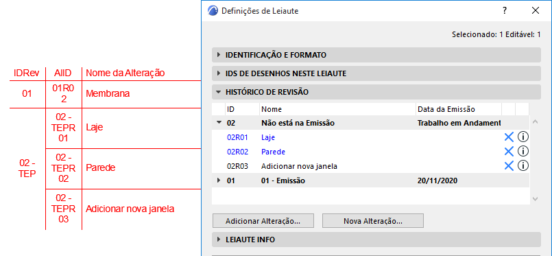 A nova Alteração é agora mostrada no Histórico de Revisões, tanto em Definições de Leiaute e no próprio Leiaute.