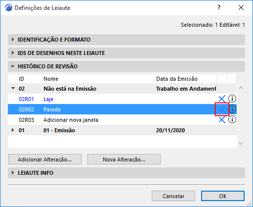 •No Histórico da Revisão do Leiaute (Definições de Leiaute), basta selecionar a Alteração desnecessária e clique no X azul para removê-la da Revisão de Leiaute. A Alteração não será exibida novamente neste Leiaute a menos que você a adicione novamente manualmente (usando Adicionar Alteração).
