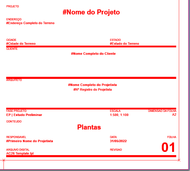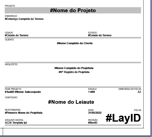 •blocos de texto com itens de Texto Automático: Dados de desenho, Leiaute e dados do Leiaute Mestre