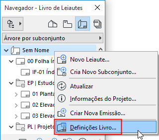 •Utilize o menu de contexto do ícone Livro de Leiautes na estrutura do Livro de Leiaute do Navegador, ou o botão Definições ao fundo do Navegador quando o ícone de Livro de Leiautes estiver selecionado na vista em árvores.