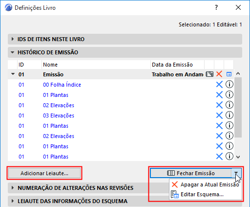Use este painel de Definições do Livro de Leiaute para criar e gerenciar Emissões como parte do gestor de Revisão.