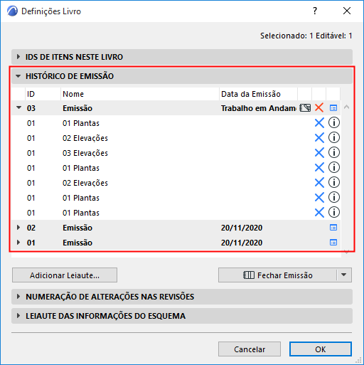 Este painel lista todas as Emissões do projeto, com as Revisões de Leiaute que pertencem a cada Emissão.