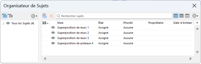 Par défaut, tous les Sujets sont visibles, ont l'état ouvert et une priorité de bas niveau.
