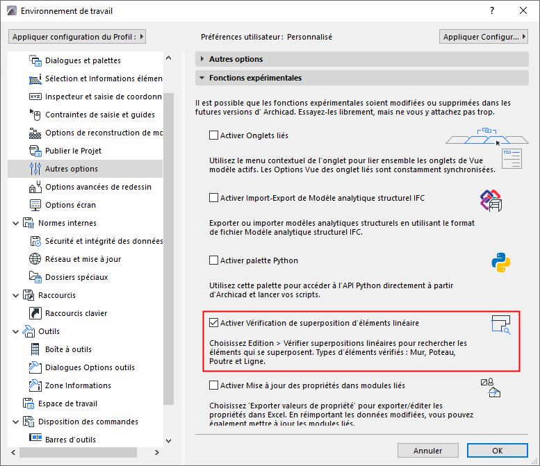 Pour nous fournir un retour, essayez la fonction, puis décochez la fonction 'Activer vérification de superposition d'éléments linéaires' et envoyez-nous vous commentaires. Merci de vos observations !