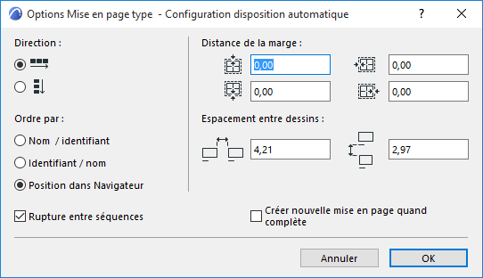 Si vous choisissez cette option, cliquez sur Configuration disposition automatique pour définir les suivants :