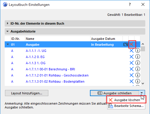 Bei jedem Erstellen einer neuen Ausgabe werden alle geöffneten Layoutindizes, die noch nicht ausgegeben wurden (und die blau angezeigt werden) automatisch der neuen Ausgabe hinzugefügt.