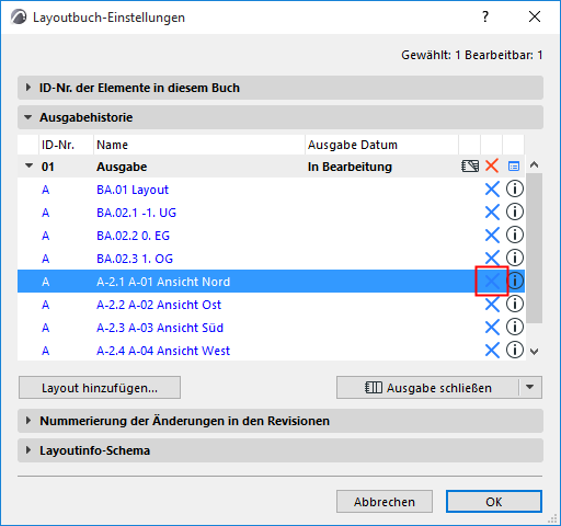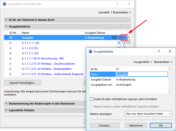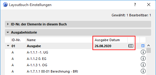 Rufen Sie die Ausgabe-Details durch Klicken auf das Symbol aus der Ausgabehistorie (in den Layoutbuch-Einstellungen) auf: