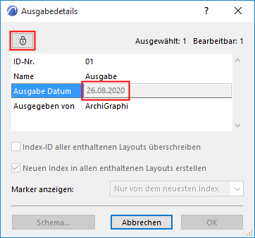 Die Daten in den Ausgabe-Details sind schreibgeschützt und können nicht mehr geändert werden. Das Dialogfenster Ausgabe-Details zeigt ein Sperrsymbol an.