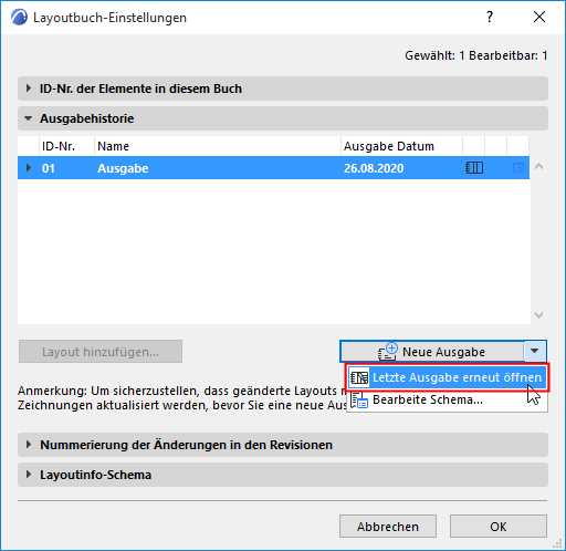 Eine geschlossene Ausgabe kann mit dem Befehl Letzte Ausgabe erneut öffnen wieder geöffnet werden
