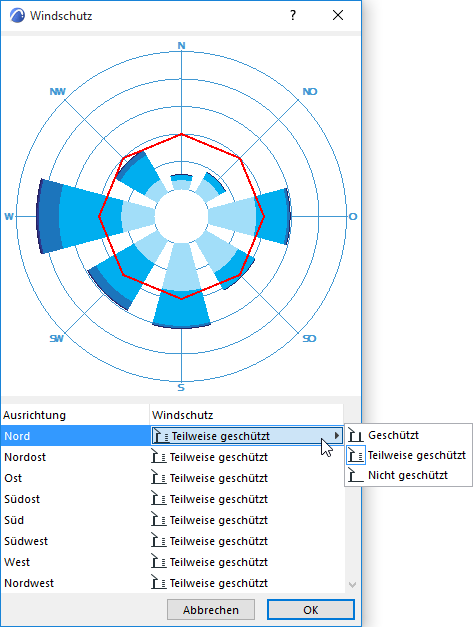 Wählen Sie hier für jede Ausrichtung des Gebäudes den entsprechenden Windschutz aus: Geschützt, Teilweise geschützt oder Nicht geschützt. Für jede Ausrichtung wird auf der Grafik ein Punkt gesetzt, der das Maß des Windschutzes kennzeichnet (je weiter außen der Punkt liegt, desto höher ist der Schutzfaktor). Die Punkte sind durch eine rote Linie miteinander verbunden.