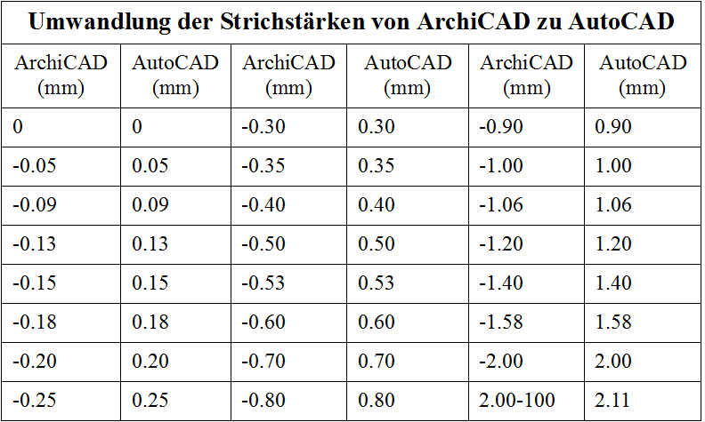 Die folgende Tabelle zeigt, wie die Archicad-Strichstärken in AutoCAD-Strichstärken umgewandelt werden, wenn dieses Kontrollkästchen nicht ausgewählt ist und die Strichstärken exportiert werden ("-0,05" bedeutet "bis 0,05").