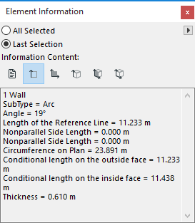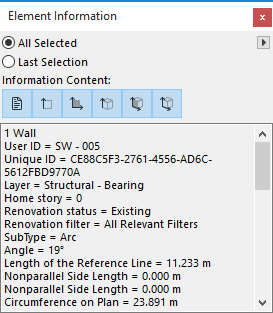 The Element Information Palette displays information (e.g. properties, dimensions) of element(s) selected on the Floor Plan. (Use Window > Palettes > Element Information to display it.)