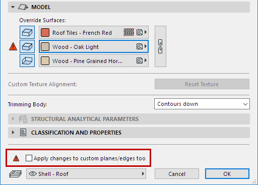 If you override the Roof edge surface in Roof Settings while the dialog box is still open, the yellow patch (indicating “custom edge”) gets a red shadow: this means that the Roof’s general edge setting is going to change: do you want to apply this override to all edges, including the custom edge(s) too?