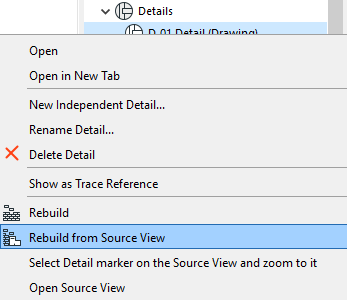 If the source view of a Detail viewpoint has been modified, update its contents with the Rebuild from Source View command (from context menu of the detail drawing listed in the Navigator, or from the View > Refresh sub-menu).