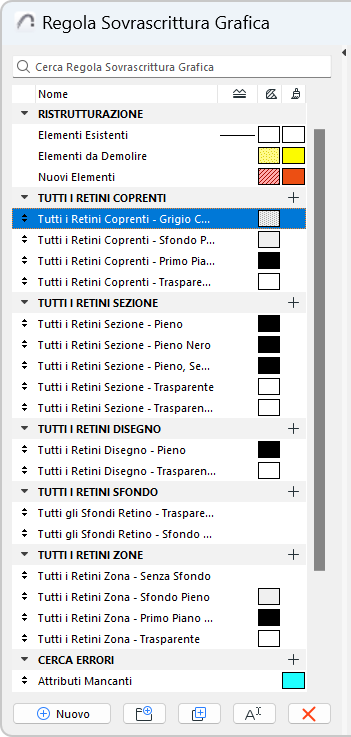 Le Regole sono elencate sul lato sinistro della finestra di dialogo. Le icone colorate indicano il Tipo di linea, il Tipo di retino, le penne di Primo Piano e di Sfondo e la Superficie (se presente) definita per ciascuna regola.