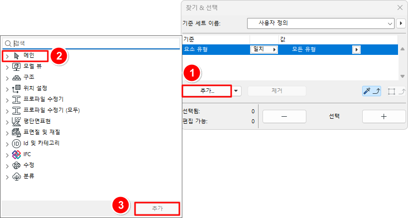 여러 개의 Archicad 기능 중에서, 기능을 시행하기 앞서 기준에 의한 요소 그룹을 명시할 수 있습니다.