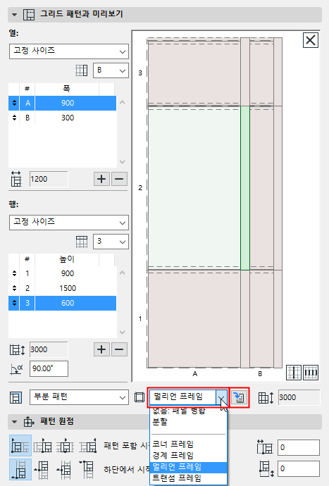 그리드 패턴의 정확한 시작점과, 패턴이 반복되는 로직은 이 계획 설정 대화상자의 패턴 원점 패널에서 정의됩니다.