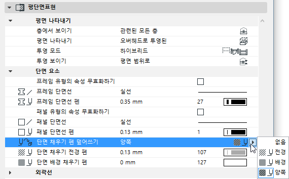 단면 채우기 펜 덮어쓰기: 필요하면, 이 요소의 채우기 전경/배경 펜을 덮어쓰기합니다 (기본적으로 빌딩 재질에서 정의함). 이것을 하려면, 단면 채우기 펜 덮어쓰기 팝업에서 각각의 컨트롤을 접근하는데 전경, 배경 또는 둘 다를 선택합니다.