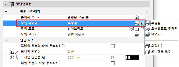 평면 디스플레이를 설정하고 나면, 투영 모드를 사용하여 커튼월의 디스플레이된 구성요소들(오버헤드, 절단, 비절단)을 미세조정할 수 있습니다.