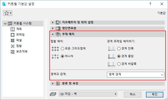커튼월 설정의 접합 페이지에서 유효한 접합 유형이 정의된 경우에 작동합니다.