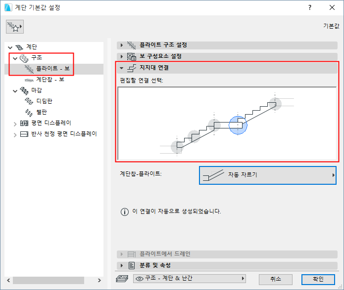 해당 계단에 엔딩과 연결을 설정하려면, 플라이트 구조 설정 페이지로 가서 지지대 연결 패널로 갑니다. 이 패널은 양쪽 계단 설정 (플라이트 구조)에서, 그리고 편집 모드에서 선택된 플라이트 구조에 대해 사용 가능합니다.