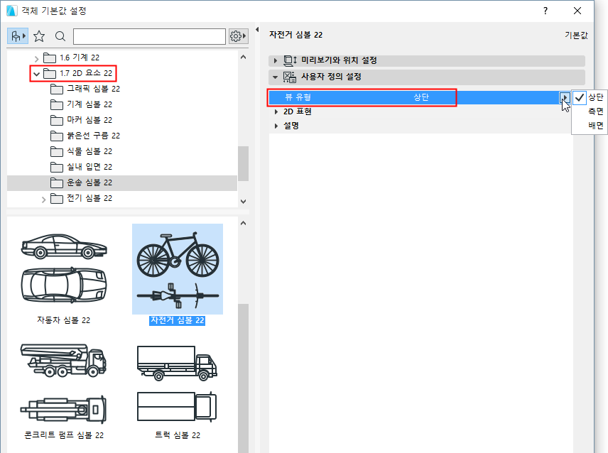 •기호를 선택하면, 심볼 유형 변수 항목이 나타나고, 거기서 정해진 심볼을 선택하여 스케일에 상관없이 2D 뷰에서 객체를 디스플레이합니다.