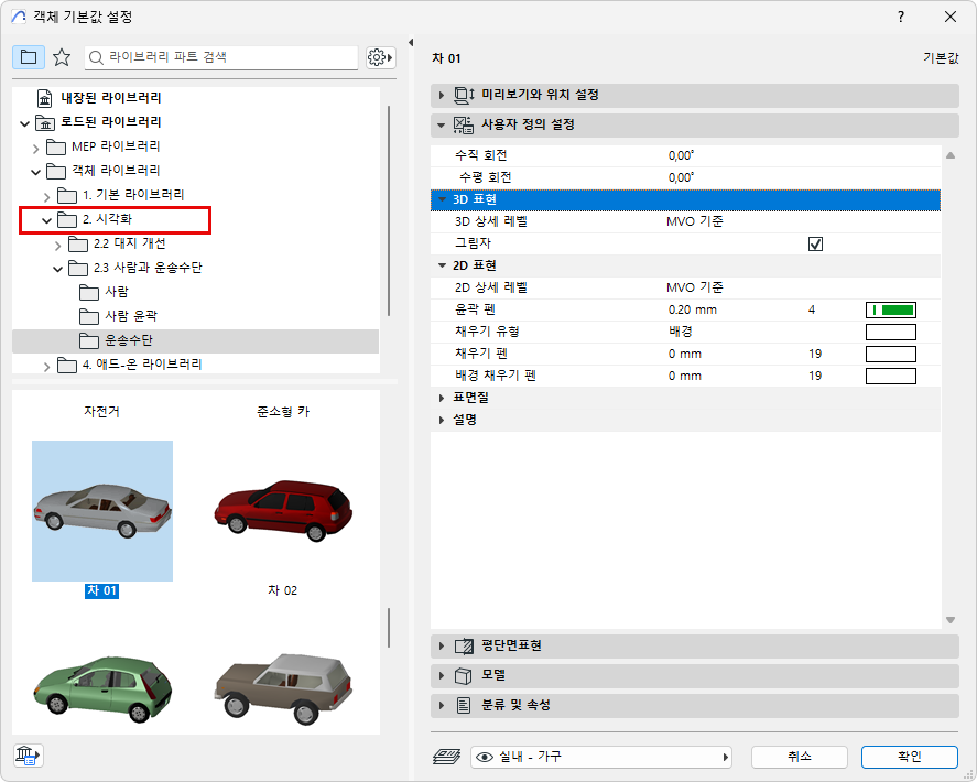 기본 설정에서, 객체 및 조명은 모델 뷰 옵션에서 정의된 디테일 레벨 설정을 사용합니다(MVO 기준). 특정 객체/조명에서, 컨트롤을 적용할 수 있다면, 요소 설정에서 그 디테일 레벨을 덮어쓰기할 수 있습니다(2D 또는 3D 표현 컨트롤을 사용).