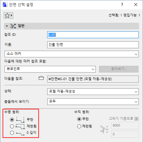 •무한: 단면 선 뒤의 모든 요소는 다른 요소들에 의해 숨겨지지 않는다면, 단면 창에서 보입니다.