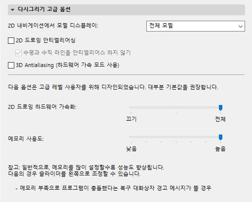 메모리 사용 슬라이더는 2D 디스플레이에 엄격하게 관련이 없는, 2D 디스플레이의 속도에 영향을 미치지 않은 Archicad 에서의 작업 방법을 정의합니다. 슬라이더는 전체로 기본 설정됩니다. 이런 경우, Archicad를 열 때, 메모리의 일부는 인덱스 요소들을 위해 예약됩니다. 이 예약된 메모리로 Archicad는 다양한 태스크- 대부분이 2D 속도에 영향을 줌- 을 빨리 할 수 있게 됩니다.