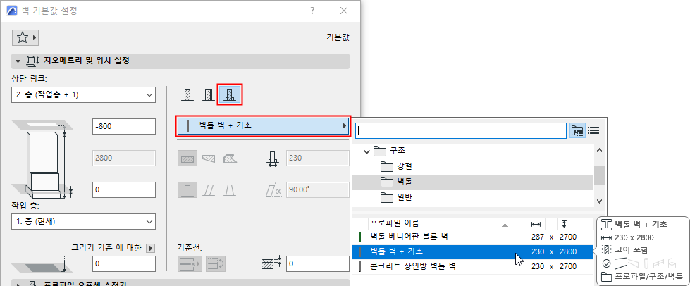 벽을 기본, 복합체, 또는 복합 프로파일로서 정의하는데 이런 아이콘 중 하나를 선택합니다, 그런 다음 그것의 구조 속성을 반영하는 개체속성을 선택합니다: