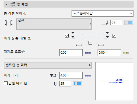 이들 컨트롤을 사용하여 층 레벨 마커의 디스플레이를 설정할 수 있습니다(층 레벨 패널에서 선택됨).