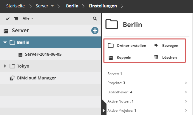 Die verfügbaren Funktionen variieren je nach Auswahl im Navigator: Server-Root, Ordner, BIMcloud Manager oder BIMcloud Server.