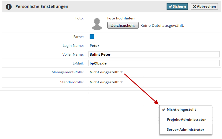 Gehen Sie zur Nutzer-Seite in BIMcloud Manager. Für jeden ausgewählten Nutzer enthält der Abschnitt Persönliche Einstellungen des Paneels Einstellungen ein Managementrollen-Popup, wo die Verwaltungsrolle ausgewählt wird: