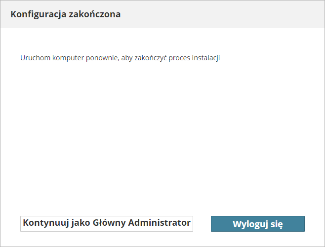 Zaleca się wylogowanie jako Główny administrator i zalogowanie jako użytkownik utworzony na etapie Tworzenia pierwszego użytkownika (powyżej). Nie zaleca się używania konta głównego administratora do codziennych czynności.
