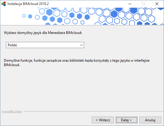 9.Wybierz język domyślny. To język interfejsu przeglądarki internetowej Menedżera BIMcloud. W razie potrzeby, język można zmienić w Menedżerze BIMcloud na późniejszym etapie.