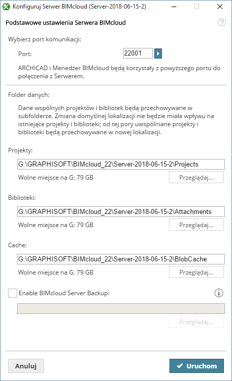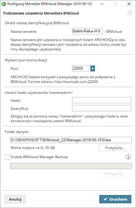 •Utwórz kopię zapasową Serwera: Zaznaczenie tego pola spowoduje utworzenie kopii zapasowej danych zapisanych na Serwerze BIMcloud. Po zaznaczeniu pola należy wprowadzić (lub wyszukać) ścieżkę folderu kopii zapasowej.