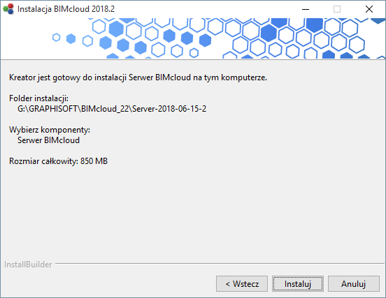 5.Panel podsumowujący pokaże Ci, w którym miejscu zainstalowany zostanie Serwer BIMcloud. Kliknij Instaluj, aby rozpocząć proces.