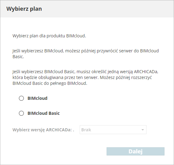 W przypadku wyboru BIMcloud Basic, należy użyć listy rozwijanej, aby wybrać jedną wersję ARCHICADa (począwszy od AC19), która będzie używana z BIMcloud Basic. (BIMcloud Basic może obsługiwać projekty tylko z jednej wersji ARCHICADa).