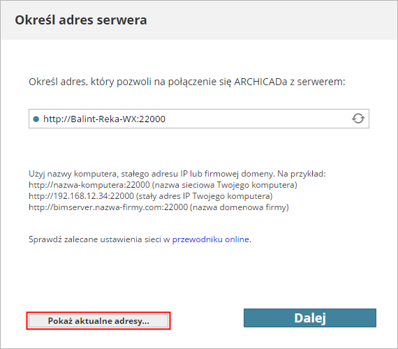 Ten adres w jednoznaczny sposób identyfikuje Twój serwer, nawet jeśli ARCHICAD łączy się za pomocą innego adresu.