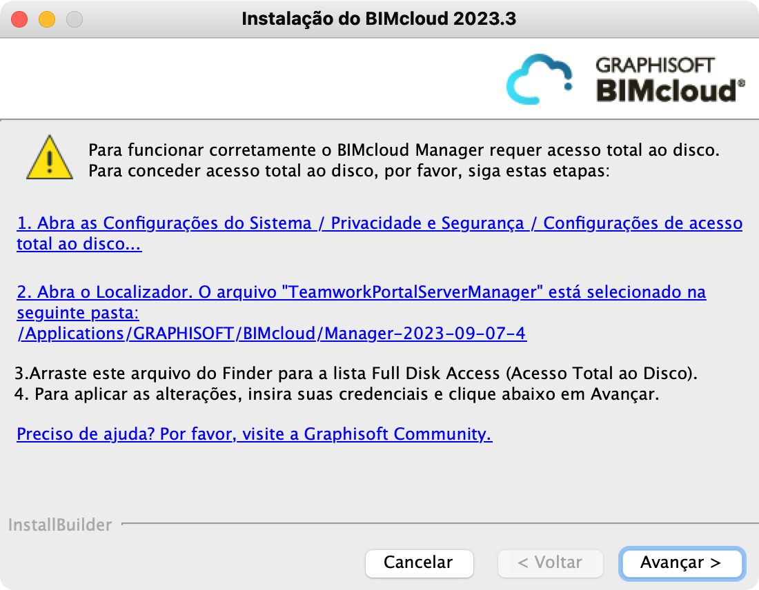 Depois de instalar ou atualizar um componente BIMcloud em um Mac, uma caixa de diálogo extra aparecerá: para que o BIMcloud funcione corretamente, você deve primeiro ativar o Acesso Total ao Disco nas configurações do macOS.