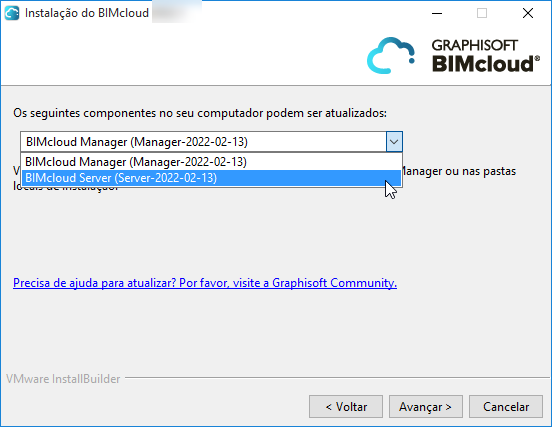 - Os componentes atualizáveis são listados no pop-up. Escolha um para atualizar (p.ex. BIMcloud Manager ou BIMcloud Server). Clique em Próximo.