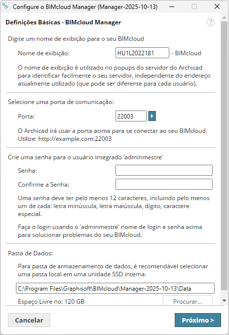 Definir configurações básicas do BIMcloud Manager na primeira página do Configurador:
