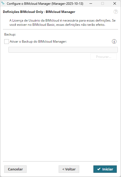 - Ativar o Backup do BIMcloud Manager: Marque esta caixa se você planeja criar backups de dados do BIMcloud Manager. Depois de marcar a caixa, você deve digitar (ou procurar) o caminho do local da pasta de backup.